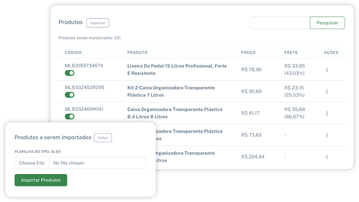 Você importa seus produtos direto do Mercado Livre com apenas dois cliques, e pronto — eles já entram na fila de monitoramento. Tudo pensado para que você tenha controle total da sua operação, sem perder tempo com tarefas manuais.