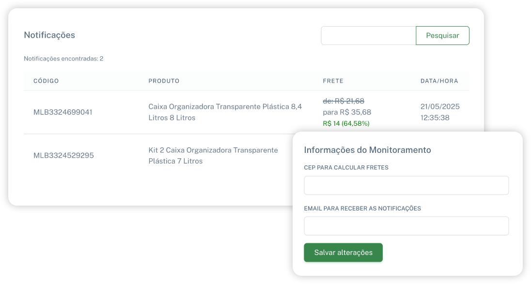 Receba notificações no momento exato que o Mercado Livre alterar o valor do seu frete